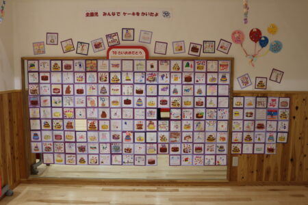 これは2階ホール『たかみ館』の展示の一部です。1~5歳児189名が70歳の幼稚園をお祝いしました。